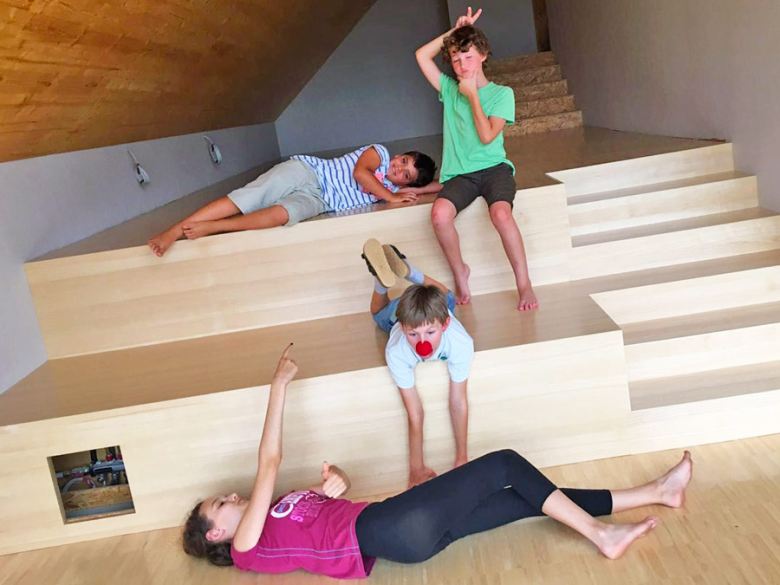 Seminars, Lectures, Conferences, Yoga and Meditation exercises — no matter what you intend to do, the seminar room in Weber is a wonderful location for your event. The seminar area consists of an approx. 90m² seminar room and a 20m² lobby with kitchenette and beverage refrigerator, a storeroom and toilet facilities. Media and light technology is provided, for both yoga and meditation exercises in a nice atmosphere as well as for all kinds of lectures and conferences. Modern LED-Technology allows e.g. various illumination colour qualities. The room is laid out for groups with up to 40 participants.